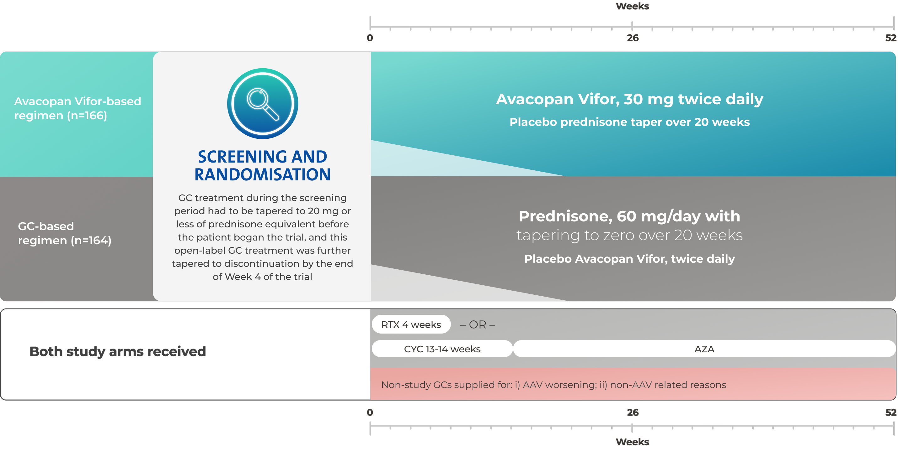 The efficacy and safety of Avacopan Vifor was evaluated in the ADVOCATE trial, an international, multicentre, active‑comparator, randomised, double-blind, double-dummy, controlled, pivotal phase 3 trial of 52 weeks duration3*
