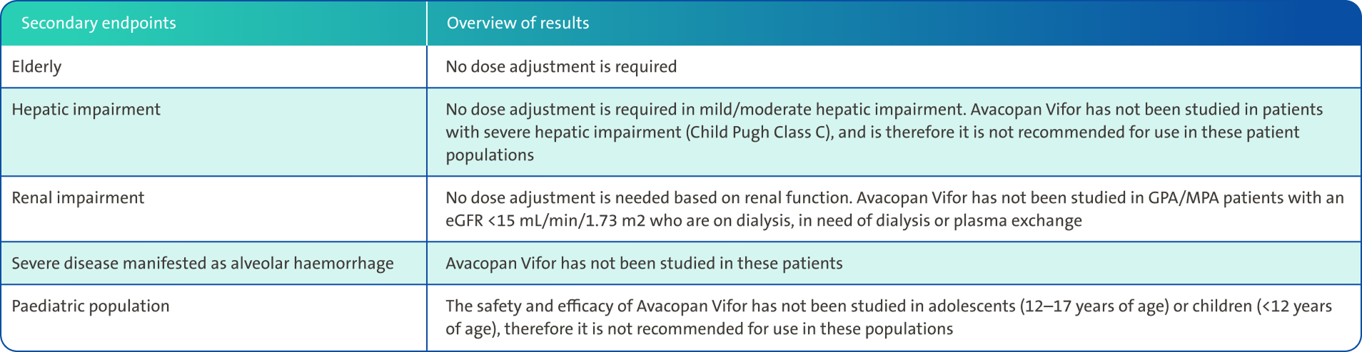 AAV and its treatment may be associated with other conditions. Special considerations for the use of Avacopan Vifor in GPA/MPA patients include: