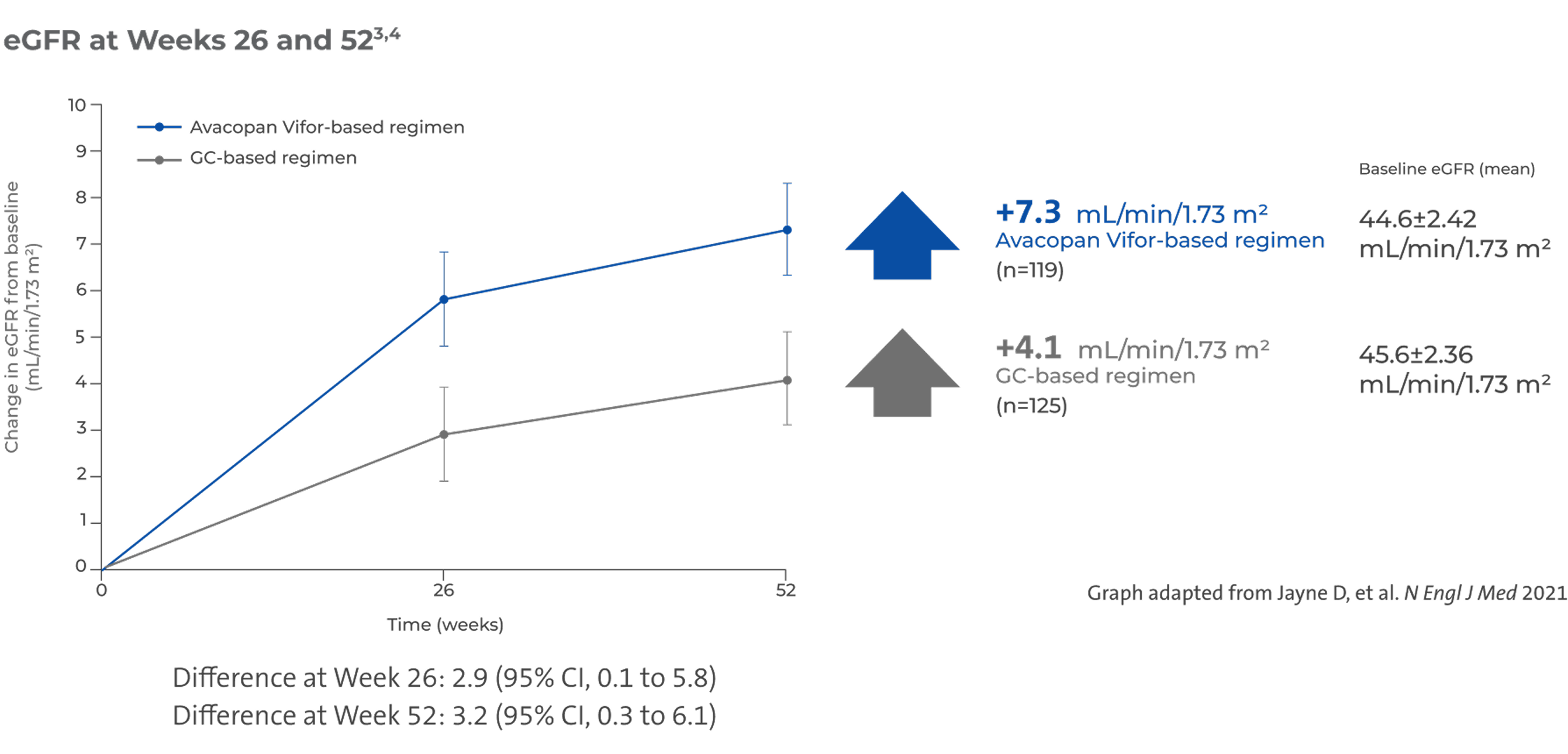 An Avacopan Vifor-based regimen and GC-based regimen demonstrated numerical increases in eGFR, compared to baseline3