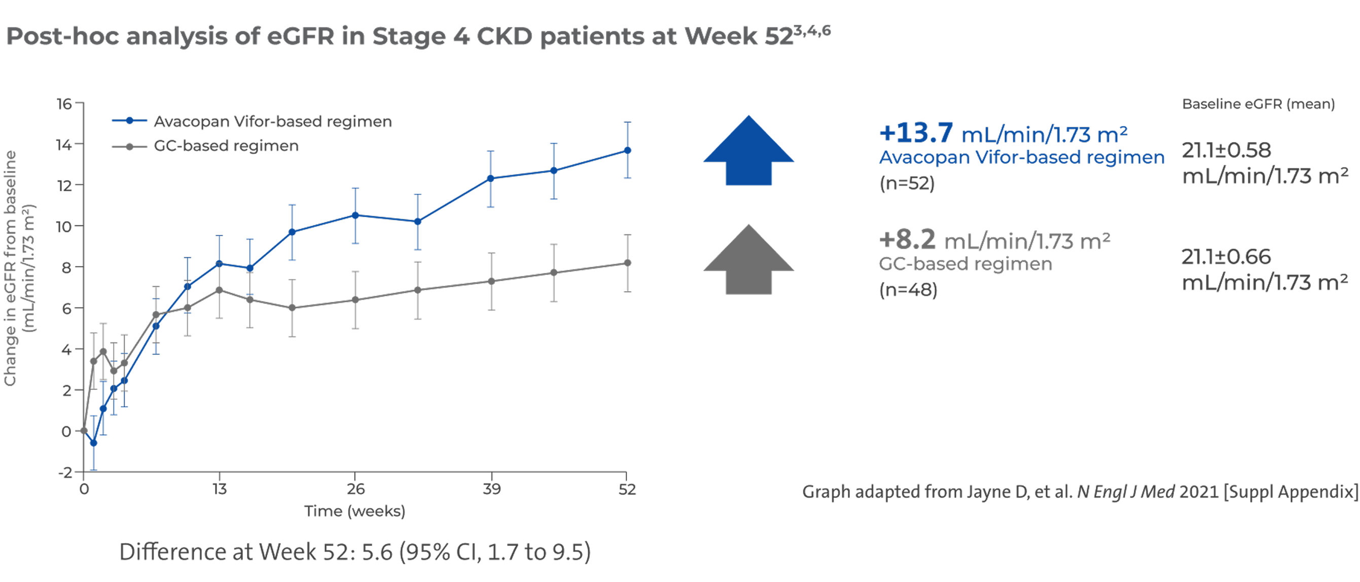 An Avacopan Vifor-based regimen demonstrated rapid improvement in albuminuria at Week 4 and numerically similar change at Week 52 across the treatment groups3,4