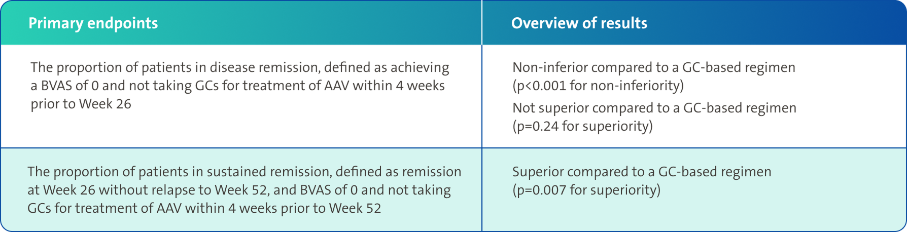 An Avacopan Vifor-based regimen was non-inferior but not superior vs GC-based regimen with respect to remission at Week 26, and superior with respect to sustained remission at Week 523*