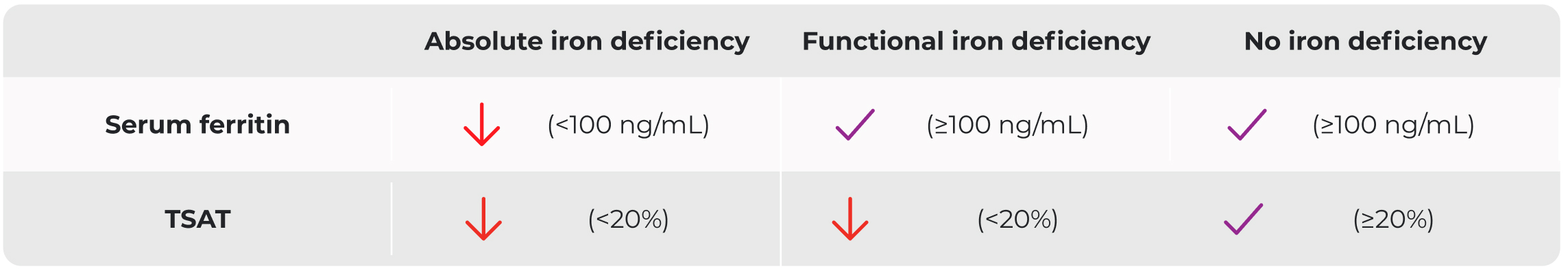 *Defined as serum ferritin <100 ng/mL or serum ferritin 100-299 ng/mL with TSAT<20%.2