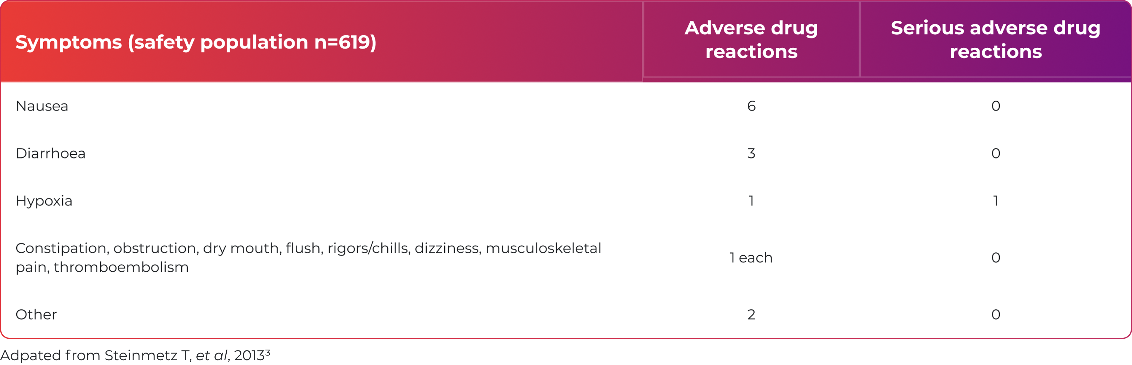 Most common adverse drug reactions (ADRs): nausea, injection/infusion site reactions, hypophosphataemia, headache, flushing, dizziness and hypertension. Most serious ADR: anaphylactic reactions