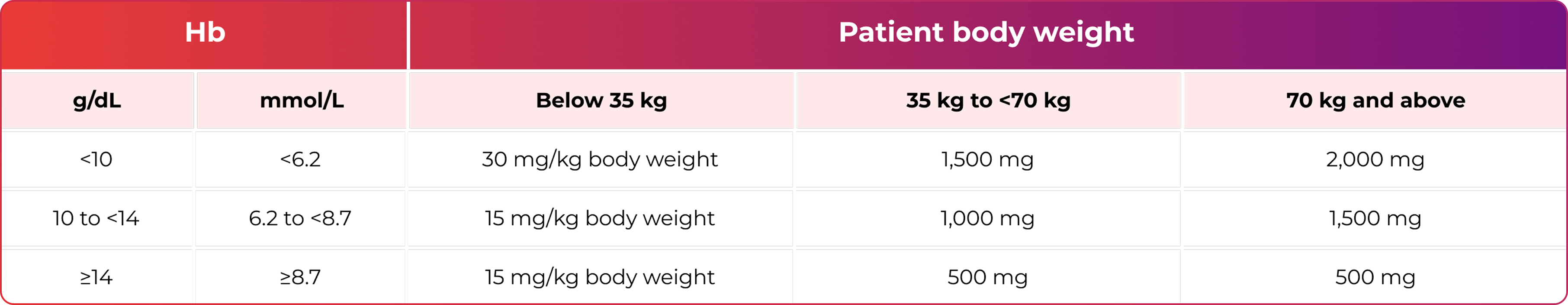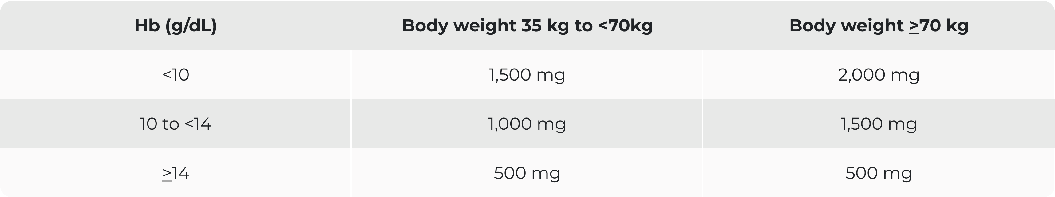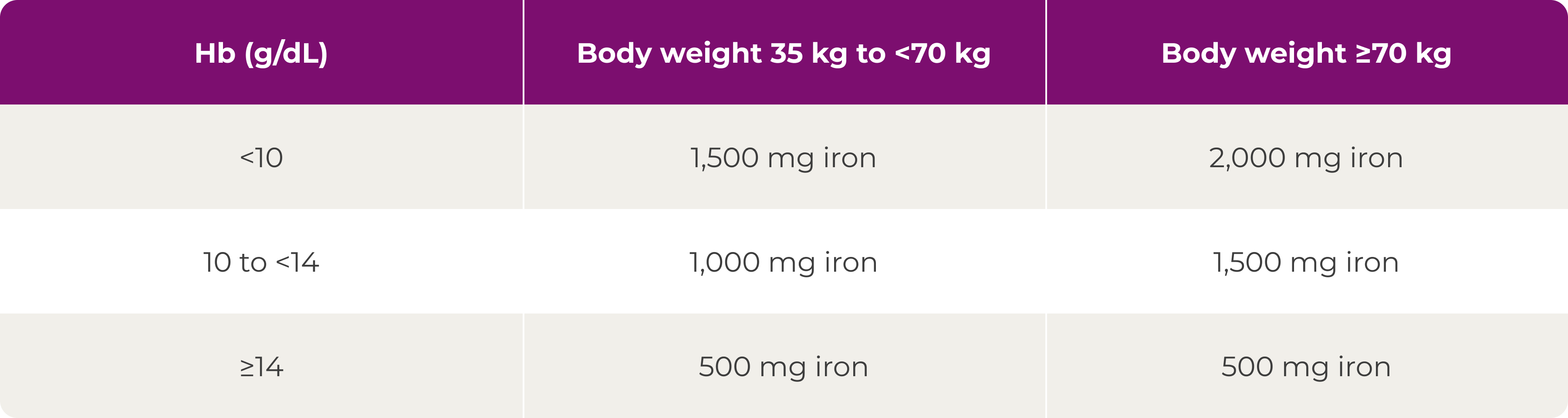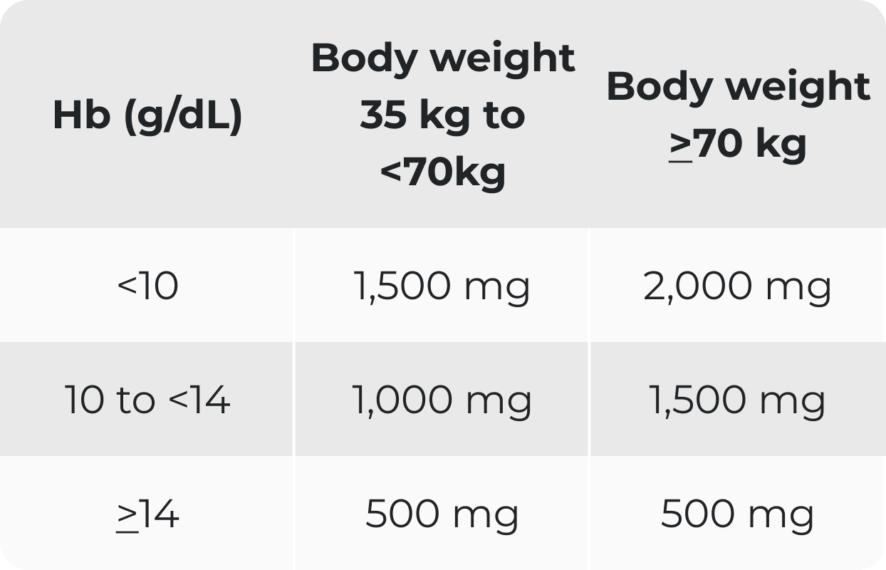 Ferinject cumulative dosing based on Hb value and body weight; two doses may be required to replenish the total iron need: