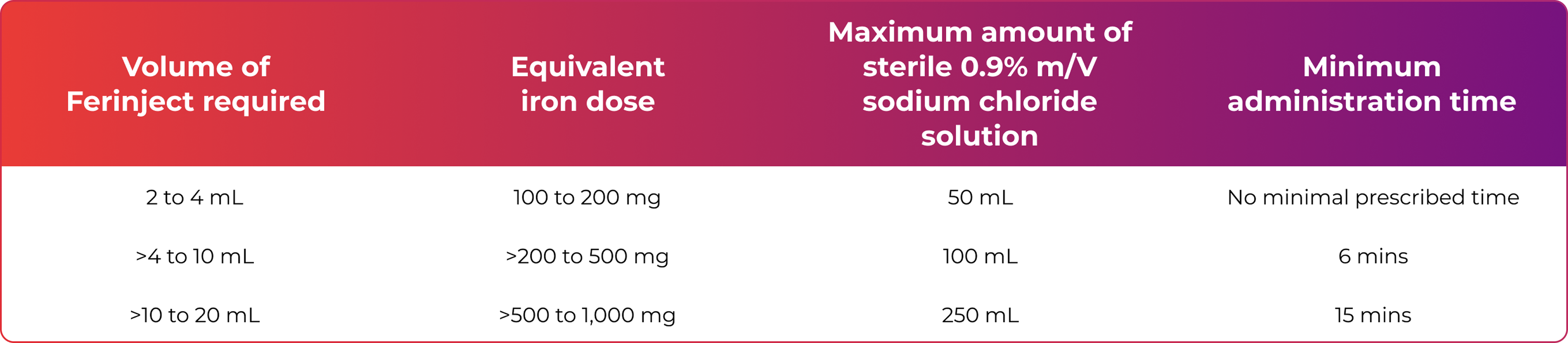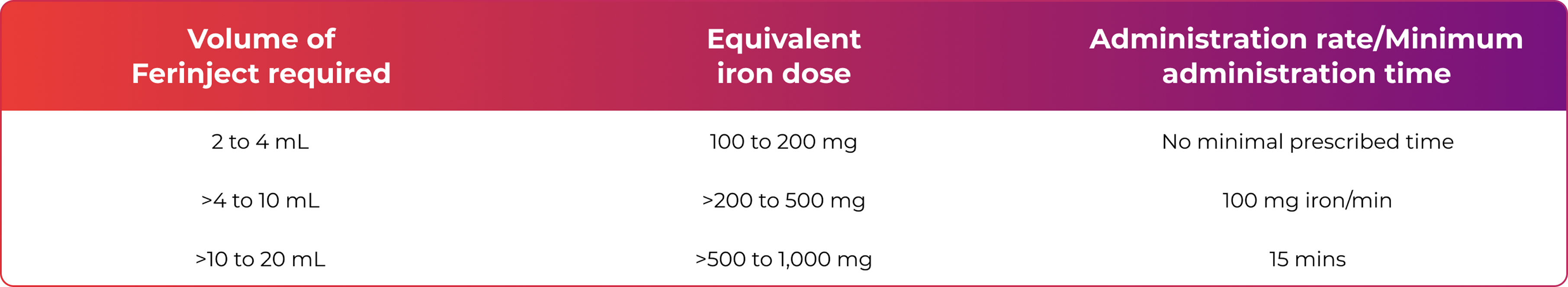 Do not administer more than 750 mg (15 mL) of Ferinject per week. If the total iron need is higher, then the administration of an additional dose should be a minimum of 7 days apart from the first dose.1