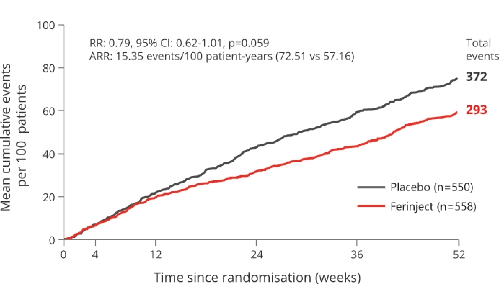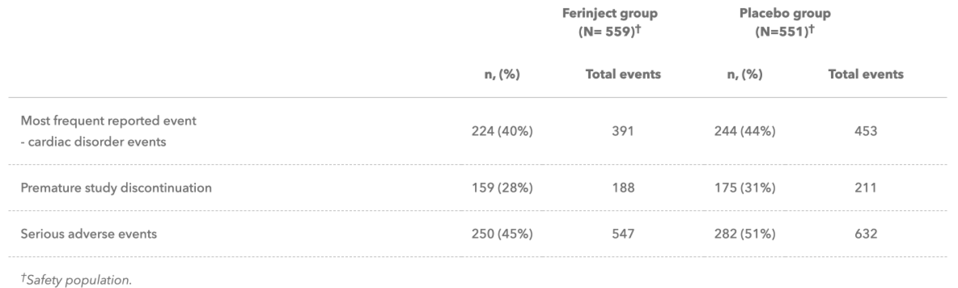 - In a multi-centre, double‑blind, randomised, placebo‑controlled trial in patients stabilised for acute heart failure (HF; N=1,108) with concomitant iron deficiency and a left ventricular ejection fraction <50%, Ferinject reduced the rate of the composite primary endpoint of cardiovascular death and HF re-hospitalisations versus placebo, but this was not statistically significant. The trial did not meet its primary endpoint of recurrent hospitalisation for HF or cardiovascular death.3